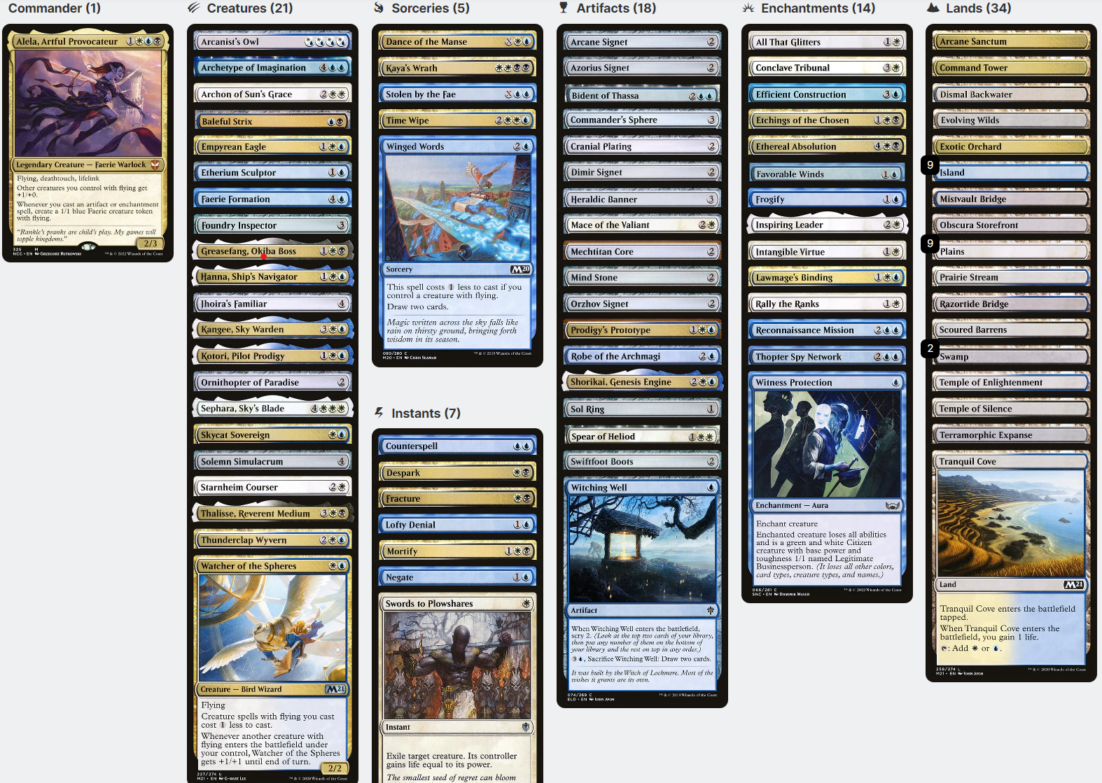 Take to the skies with Alela, Artful Provocateur. This queen of flying creatures commands this deck full of the game's best. It contains lots of ways to make flyers bigger, and a healthy dose of disruption to protect them while keeping your opponent's down.