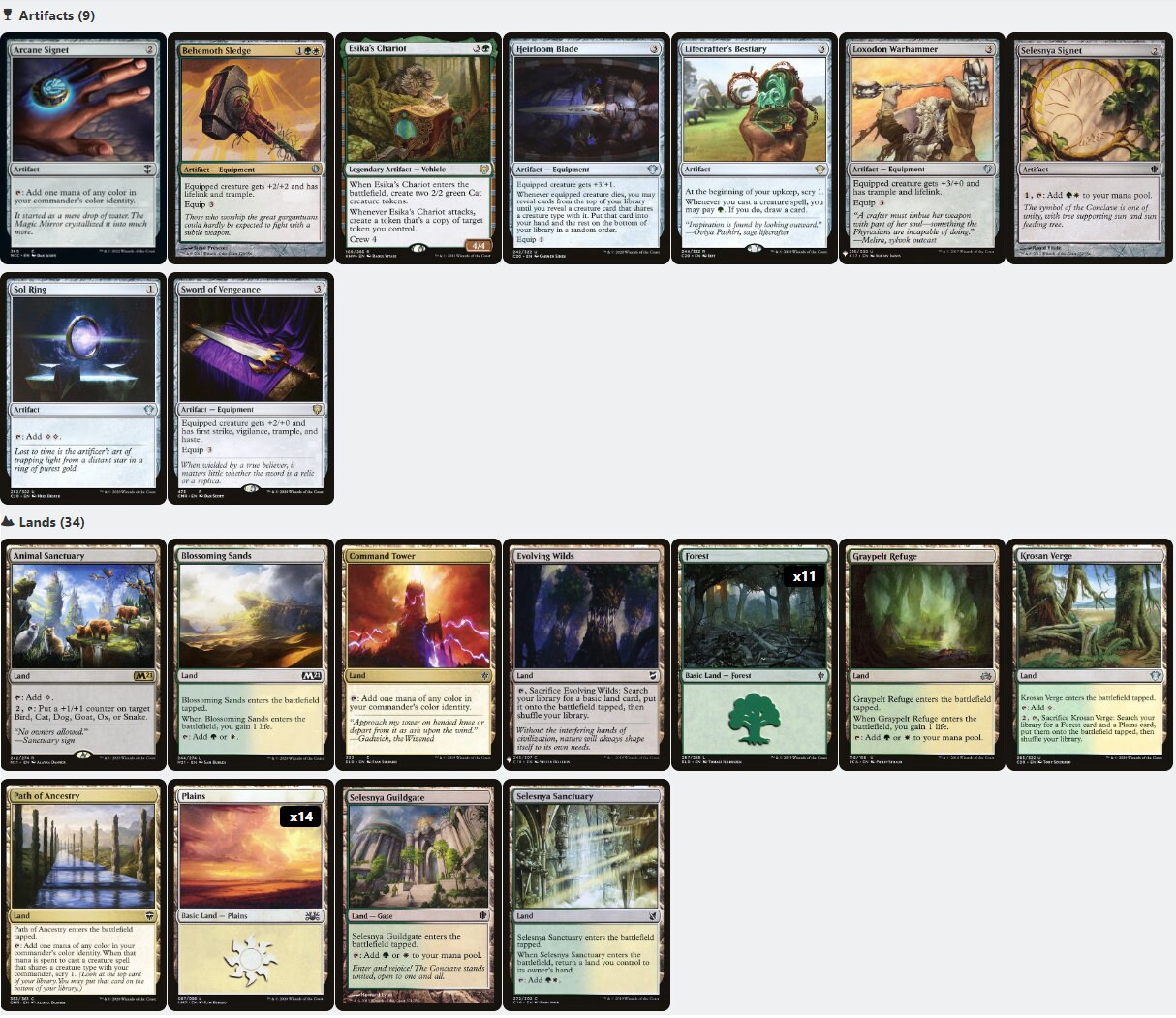 A complete 100-card Commander/EDH deck, made of authentic English-language Magic: the Gathering cards in near-mint to slightly played condition.