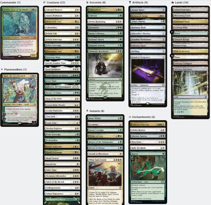 Kitty has claws! Commander Arahbo, Roar of the World makes Cat Tribal not only a reality, but a powerhouse with flavor to match. This deck has all the cute and fearsome felines in Magic, including Kaheera, the Orphanguard with its Companion ability.