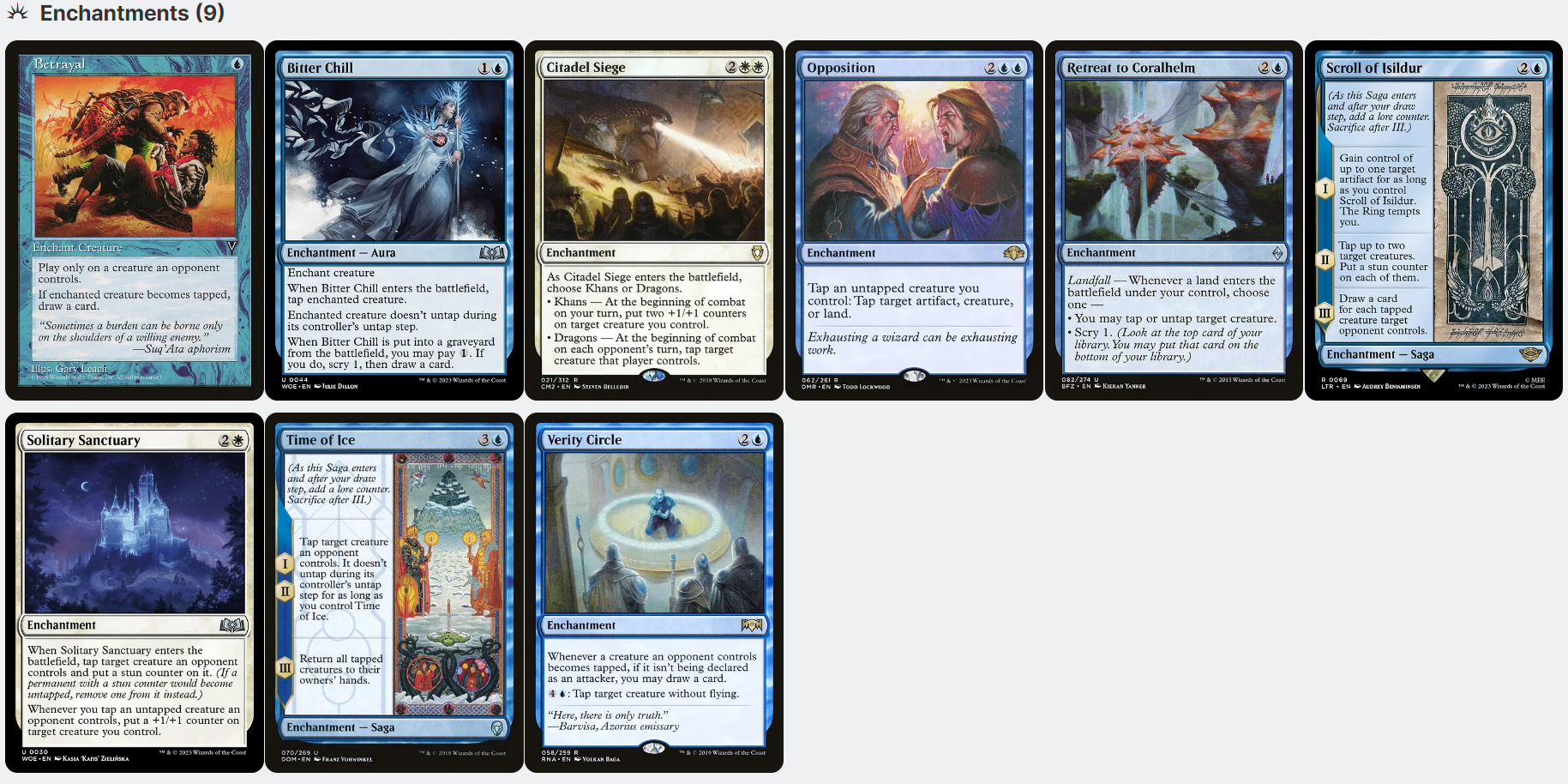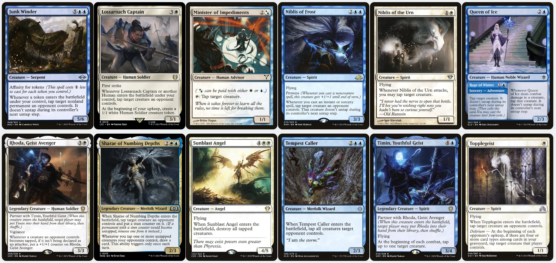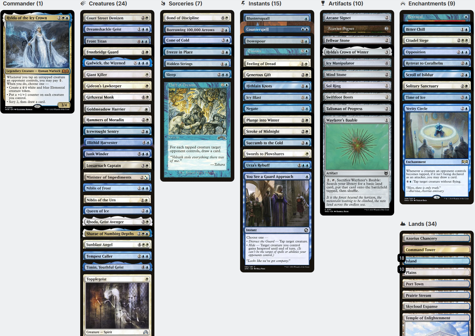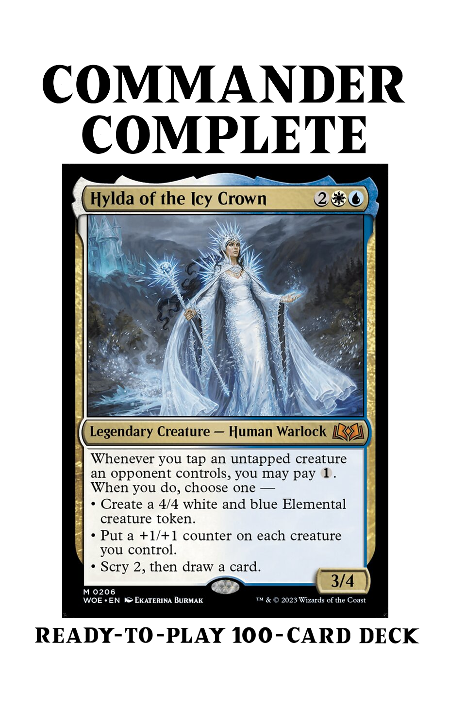 Wilds of Eldraine brings Commander Hylda of the Icy Crown to rule this deck based around tapping opposing creatures to enable her activated ability, whether it's generating 4/4 creature tokens, adding +1/+1 counters, or scrying and drawing cards.