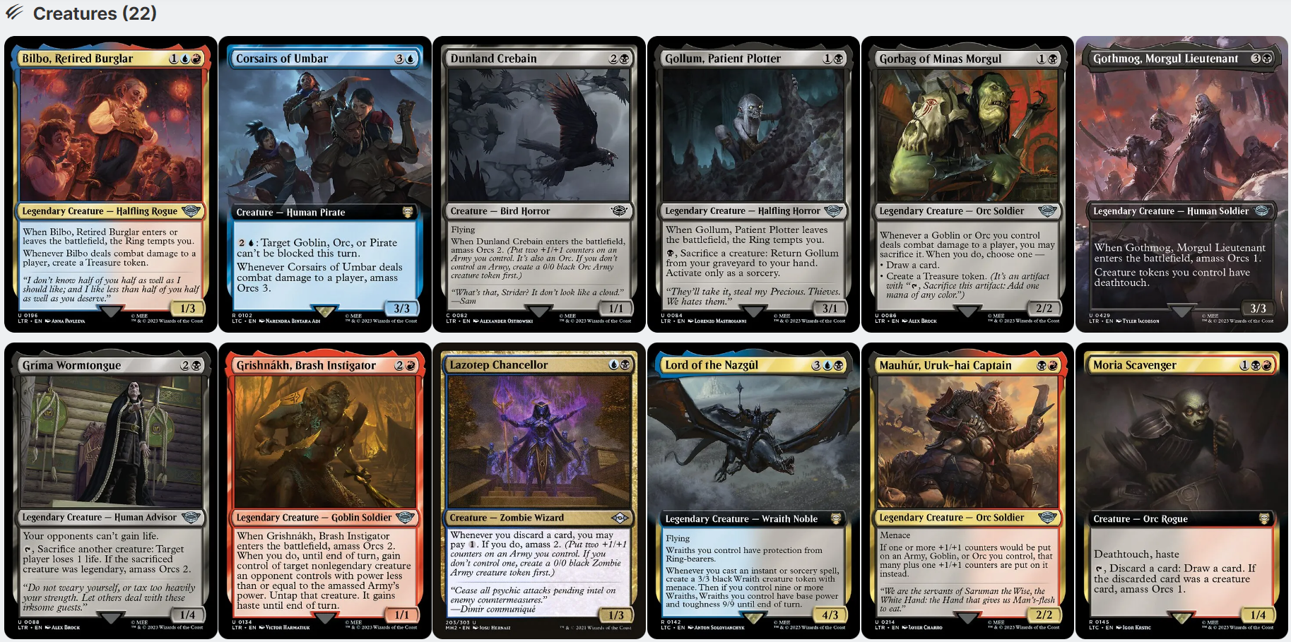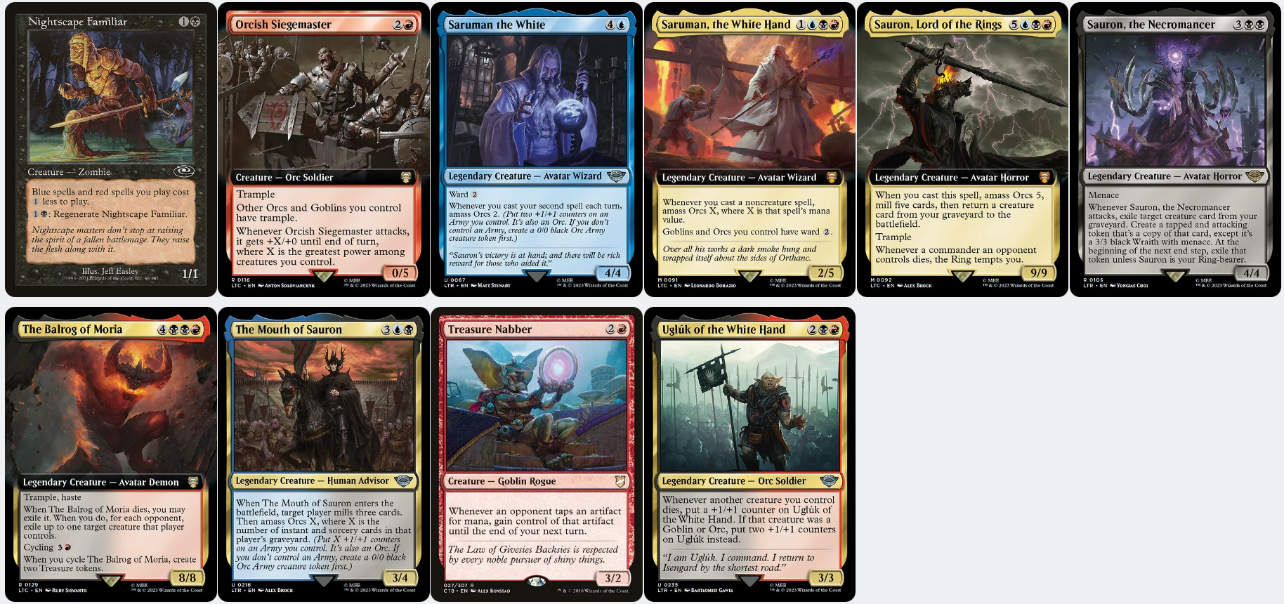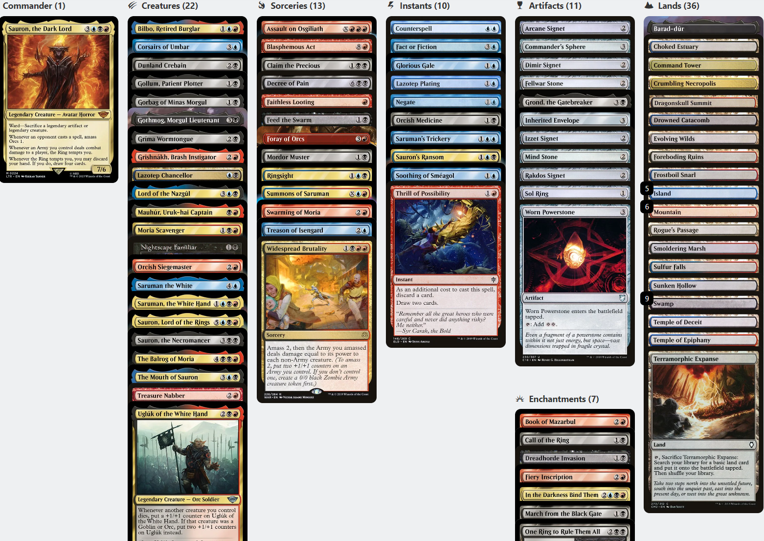 Designed to make the most of all four of Sauron's abilities, Amass an Army of Orcs while the Ring Tempts you, and control the battlefield with Sauron's evil hand providing a constant stream of removal and counterspells.