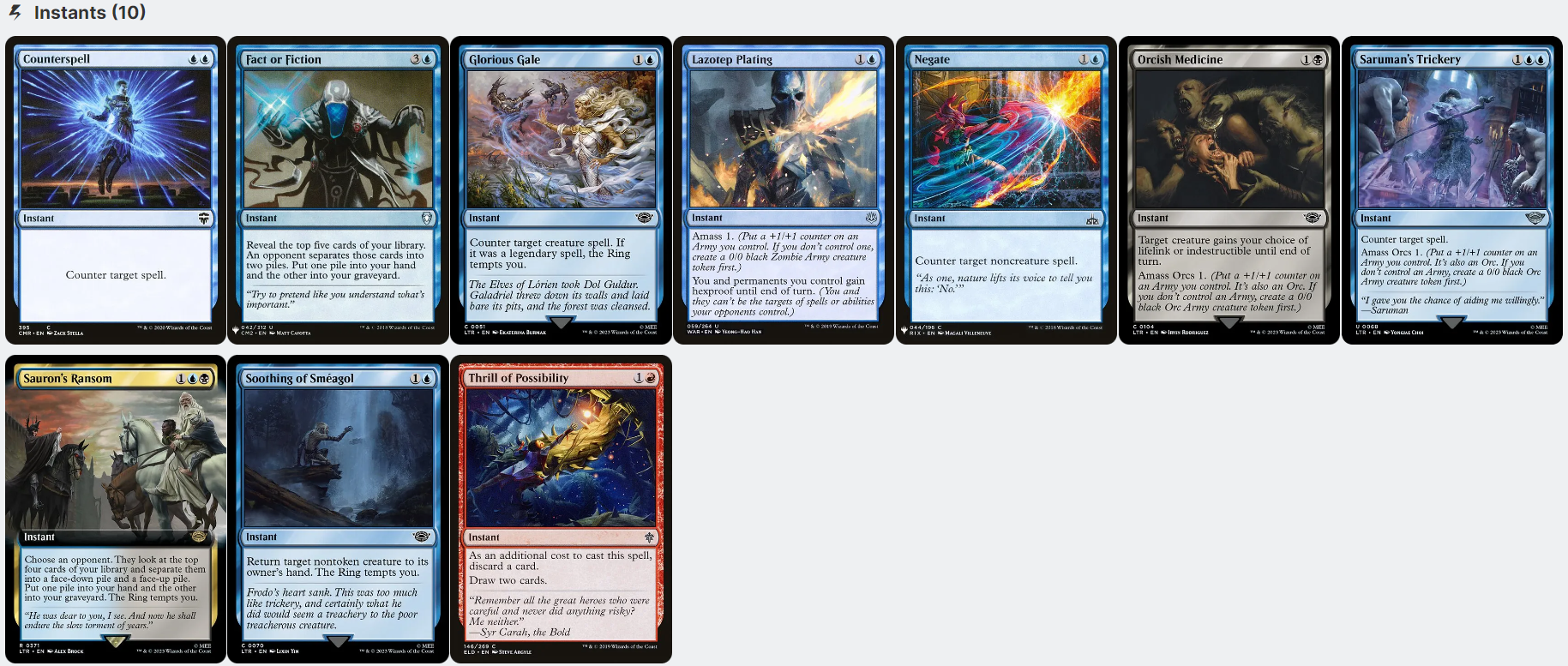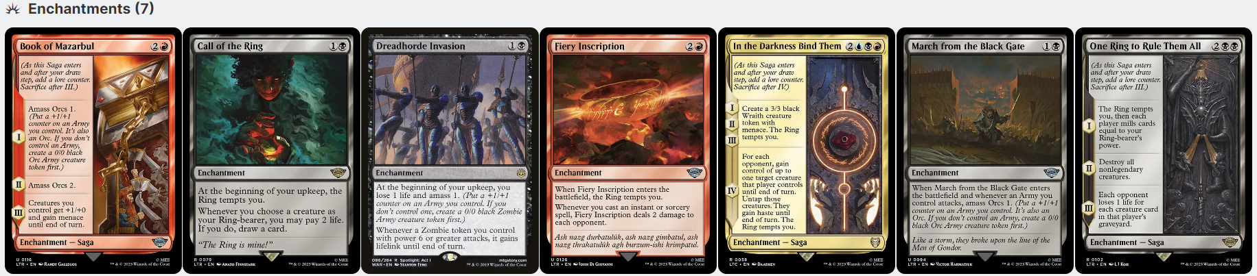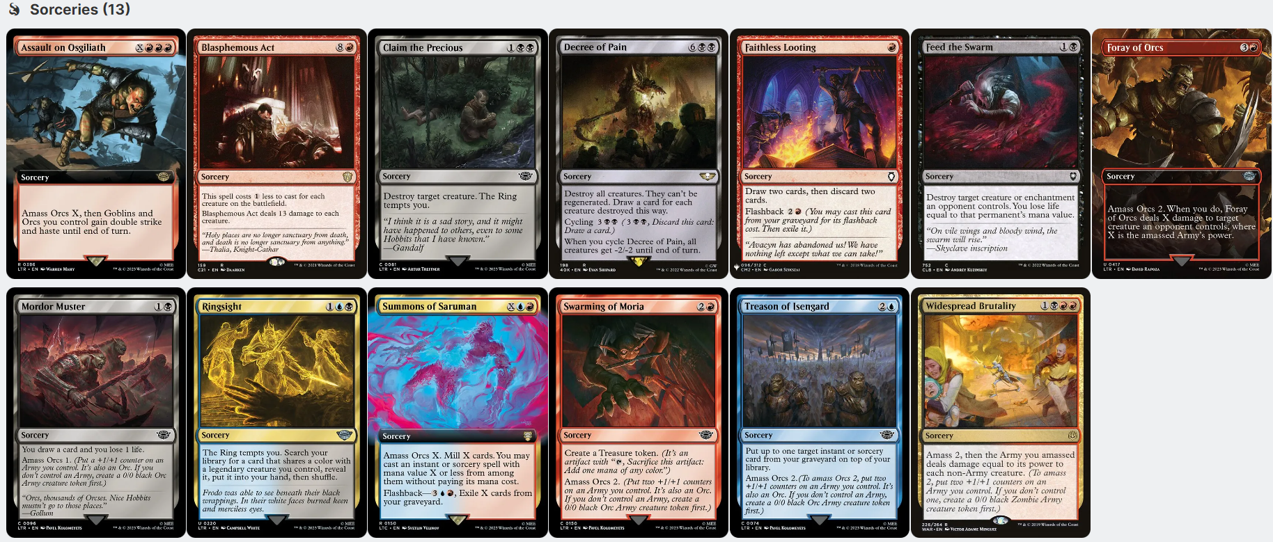 Designed to make the most of all four of Sauron's abilities, Amass an Army of Orcs while the Ring Tempts you, and control the battlefield with Sauron's evil hand providing a constant stream of removal and counterspells.
