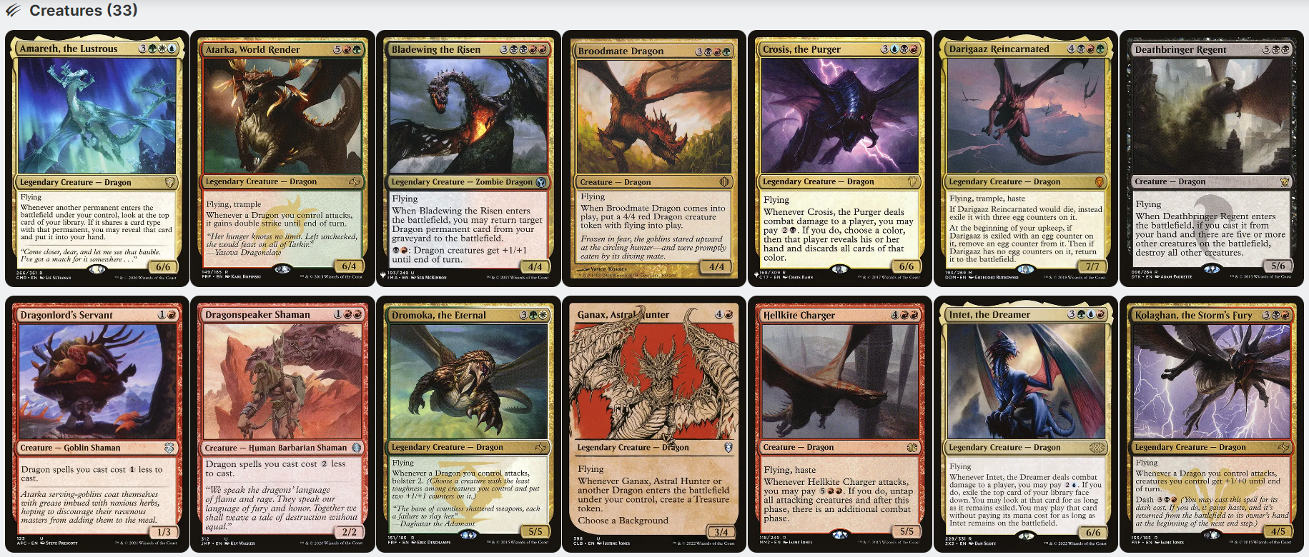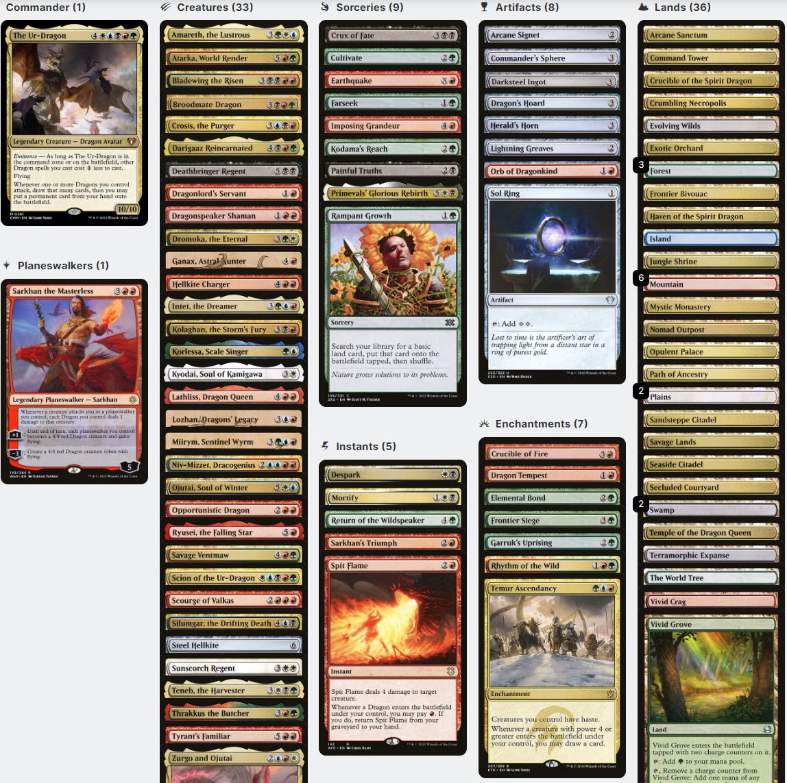 Dragons are the coolest creatures, and this tribal deck combines the best of them under the banner of Commander The Ur-Dragon, which makes them all cheaper from the command zone! This version of the deck spares no expense, playing all the most powerful dragons and best Commander cards available.