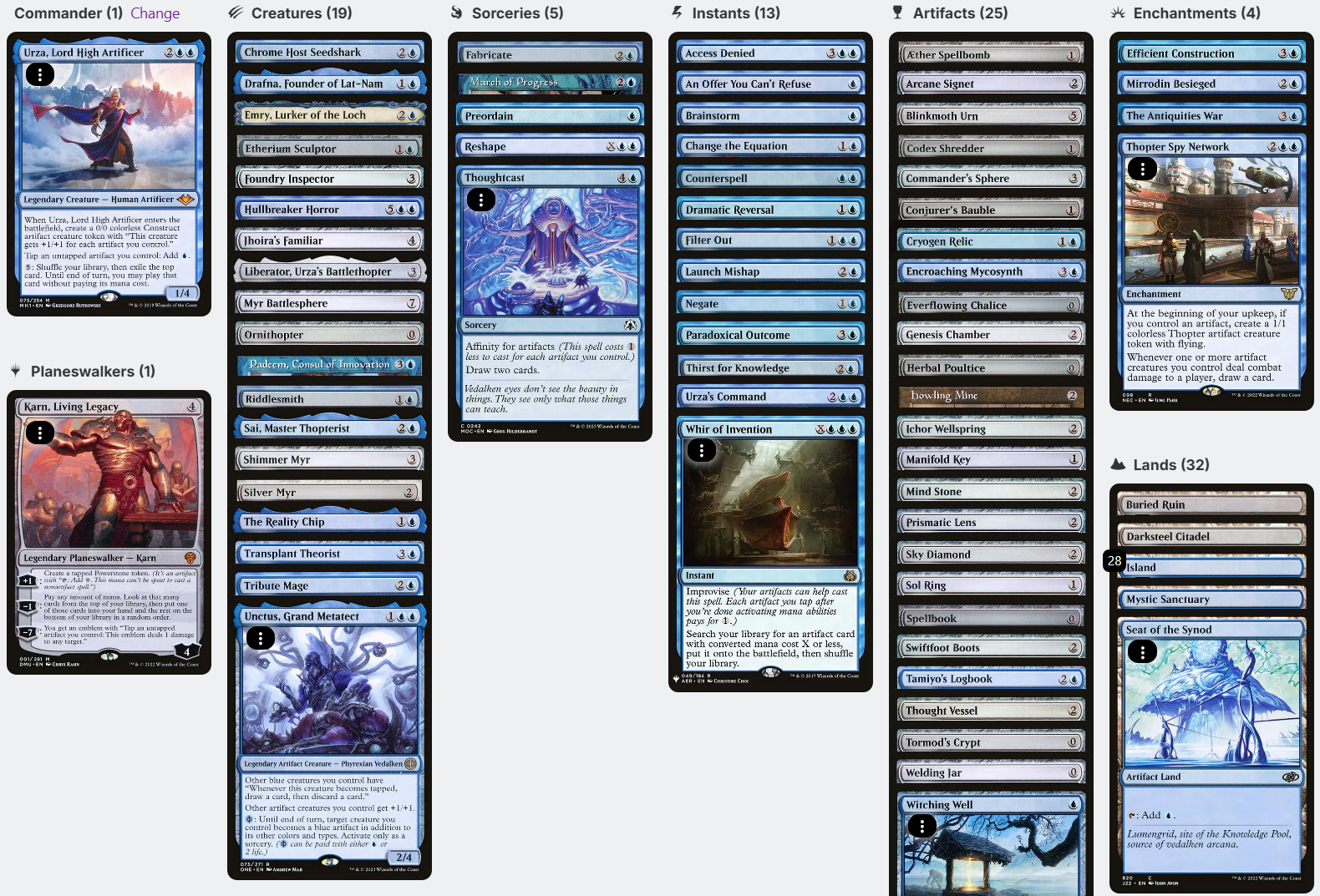 Urza, Lord High Artificer rules over this deck all about artifacts. Full of artifact mana, card draw, tutors, and artifact synergies, this deck plays like a well-oiled machine and grows in power through the game until it becomes an unstoppable force.